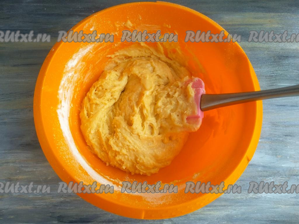 Тесто должно получиться в меру густым, по консистенции напоминающим тесто для сырников. Оставить его под полотенцем на 10 минут.