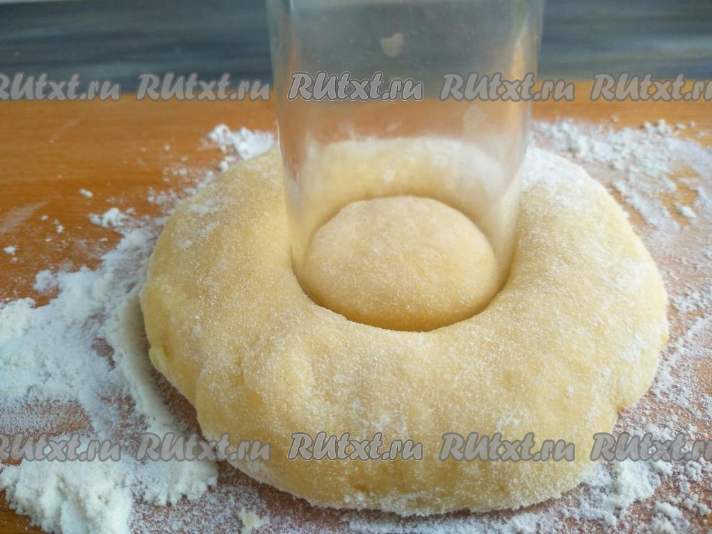 Рюмкой вырезать отверстие в центре лепёшки. Аналогично сформировать все бездрожжевые пончики.