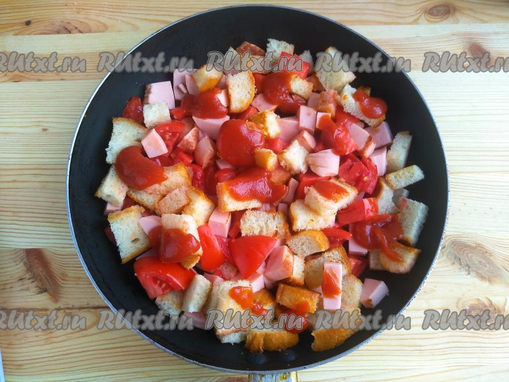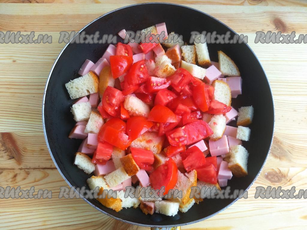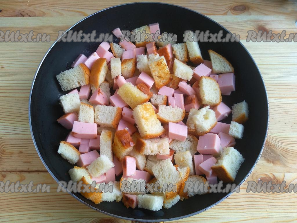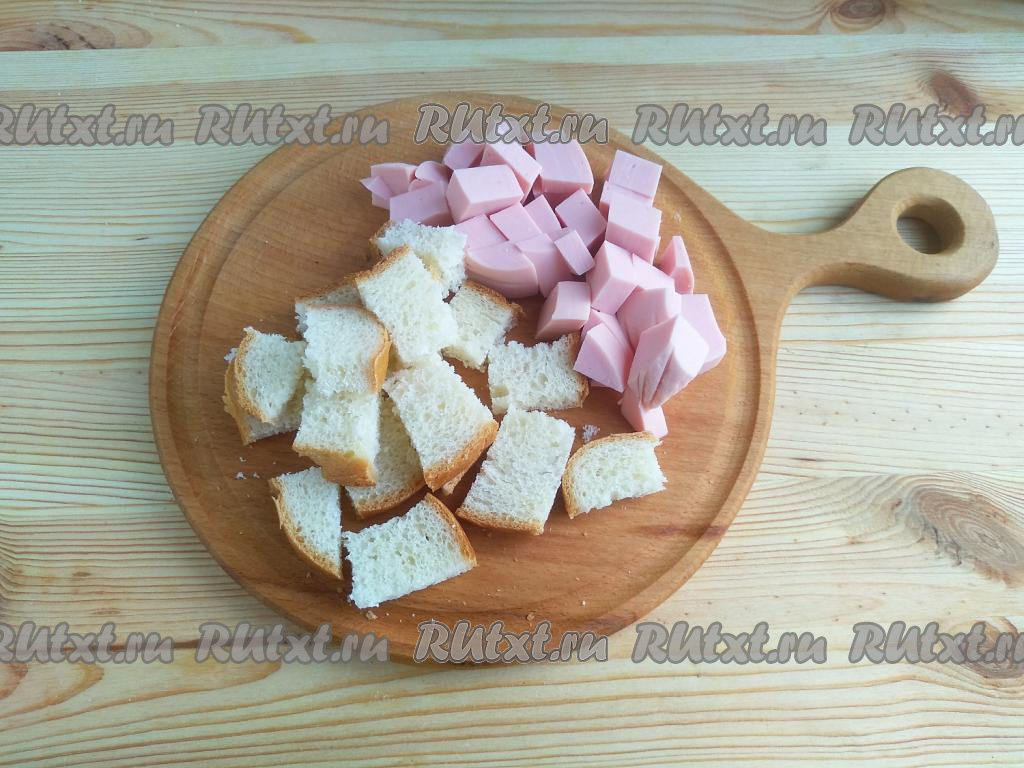 Хлеб нарезать на ломтики со стороной размером 1-2 см. Колбасу нарезать кубиками с размером стороны 0,8 см.