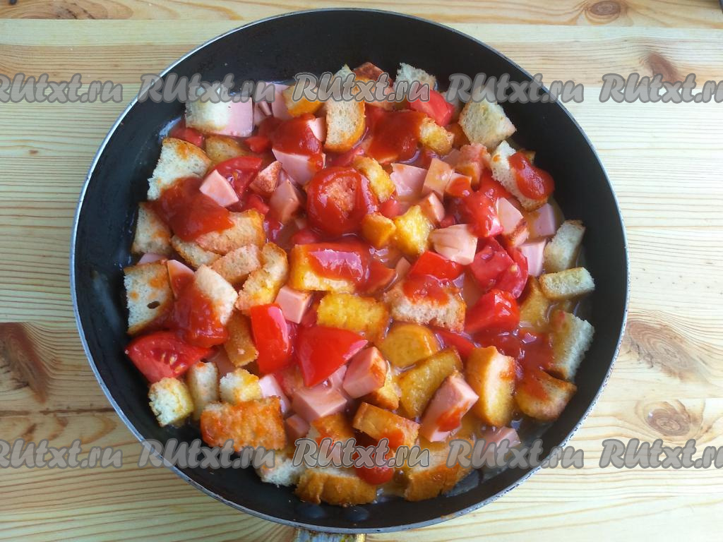 На сковороду влить 1 столовую ложку растительного масла, выложить кусочки колбасы и батона, обжарить их на среднем огне до лёгкого зарумянивания, постоянно помешивая.