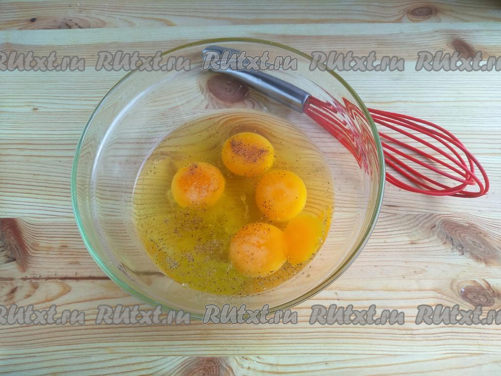 Яйца выложить в миску, добавить соль, 1 столовую ложку растительного масла, чёрный молотый перец, перемешать венчиком яичную смесь.