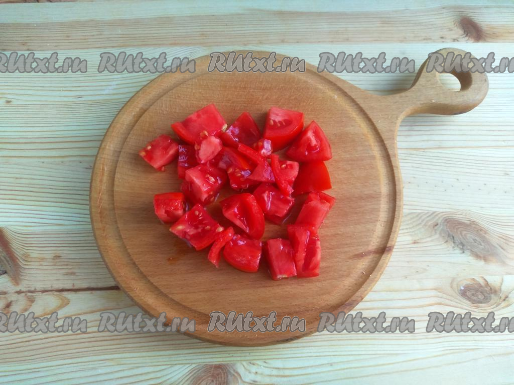 Помидоры очистить от плодоножки и нарезать небольшими кусочками.