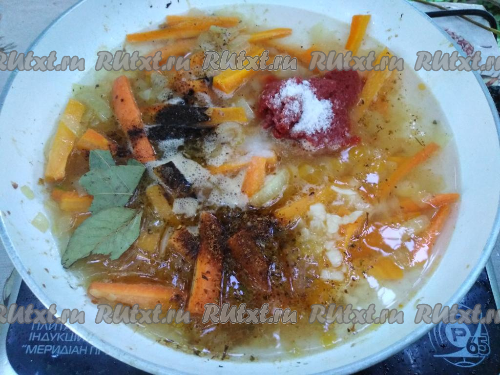 В сковородку к обжаренным овощам добавляем 0,5 стакана воды, томатную пасту, лавровые листы, 1 чайную ложку соли, чёрный молотый перец, приправу для курицы и мелко нарезанные зубчики чеснока.