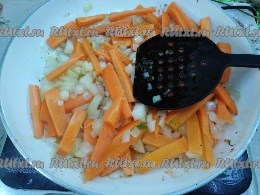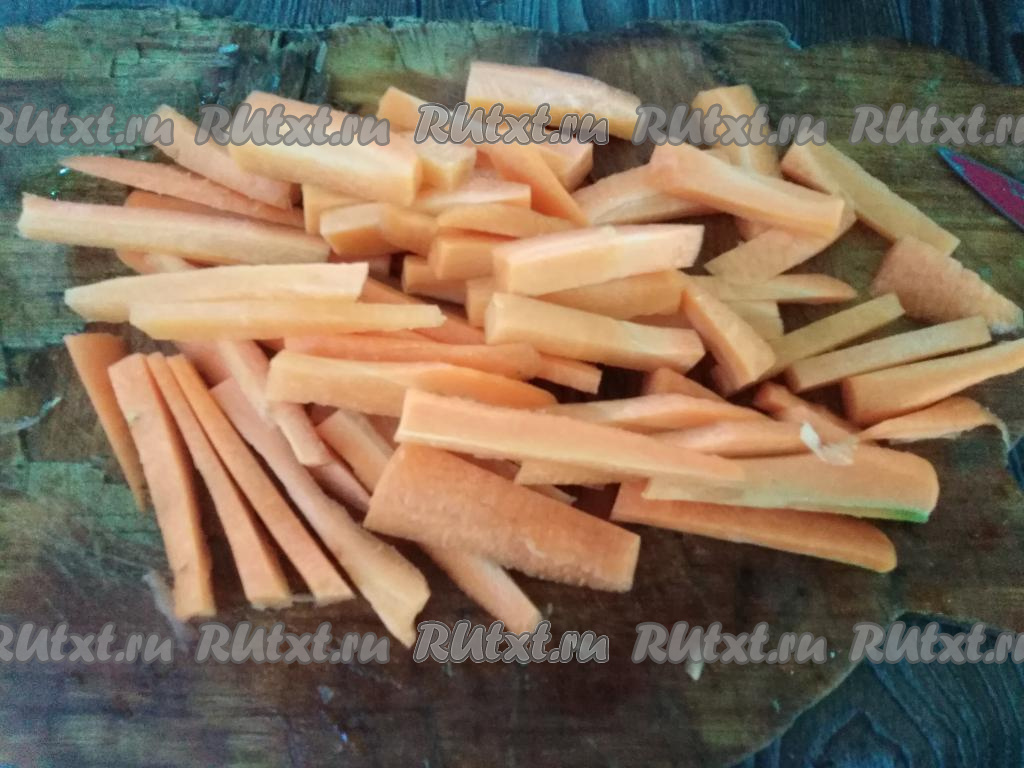 Затем очищаем от кожуры морковку и нарезаем крупной соломкой. Мелко резать не стоит, так как при тушении она разварится. Морковь, нарезанная, как на фото, после тушения остаётся плотненькой, но не твёрдой.