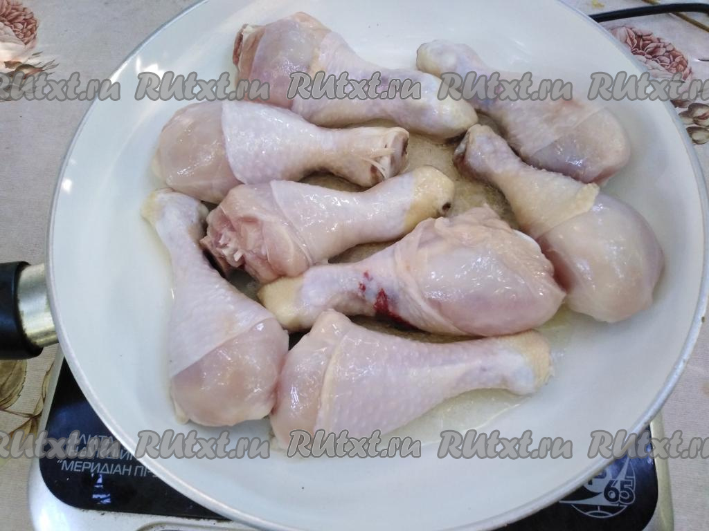 Я для этого блюда взяла куриные ножки, но можно приготовить жаркое из любых частей курицы. Ножки сначала промываем под струёй холодной воды, после просушиваем от влаги, добавляем 1 чайную ложку соли. Втираем соль в кусочки курицы. Выкладываем ножки (или другие части курочки) на сковороду, разогретую с растительным маслом и обжариваем на среднем огне с одной стороны в течение 4 минут (до лёгкой румяности), затем переворачиваем кусочки курицы и жарим с другой стороны минут 5. Также можно пожарить всё и в мультиварке на функции "Жарка".