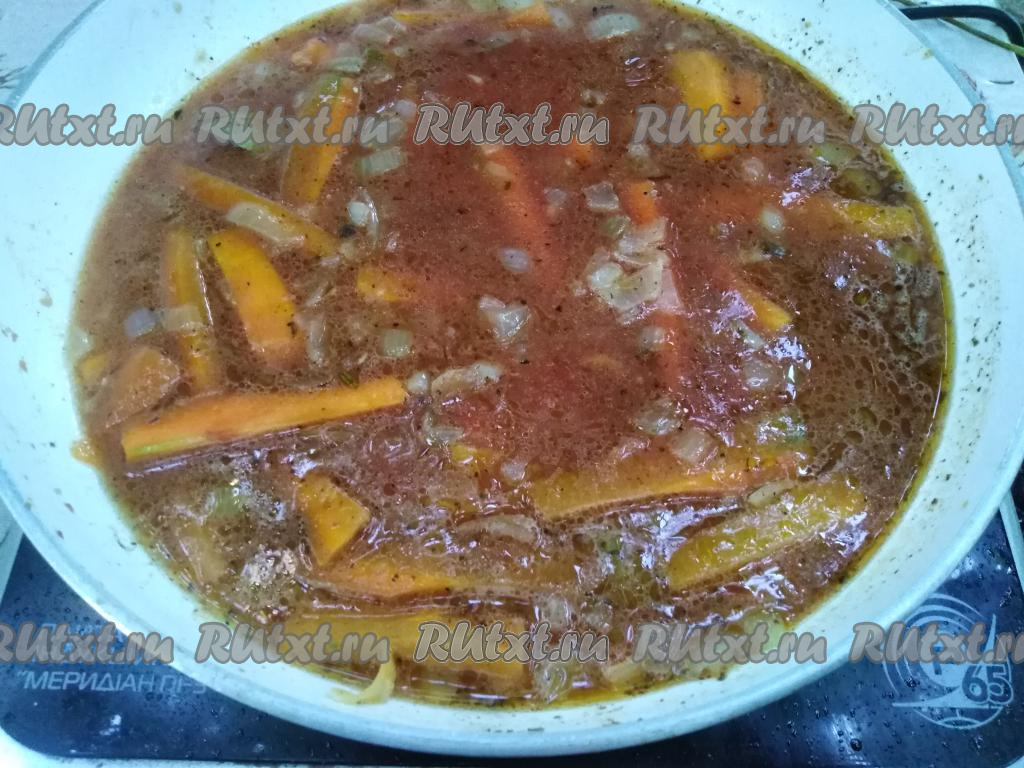 Перемешиваем содержимое сковородки и, дав закипеть, томим овощную зажарку на медленном огне 6 минут.