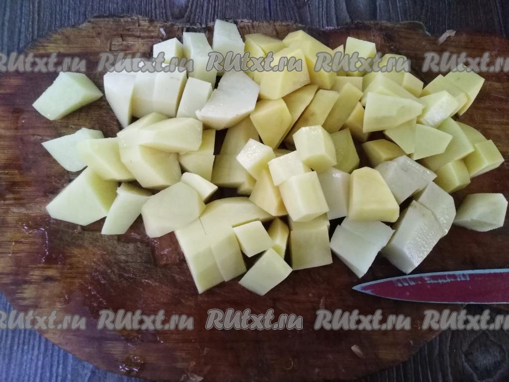 А пока займёмся картофелем. Очищаем картошку от кожуры, промываем водой и нарезаем картофель средними кусочками.
