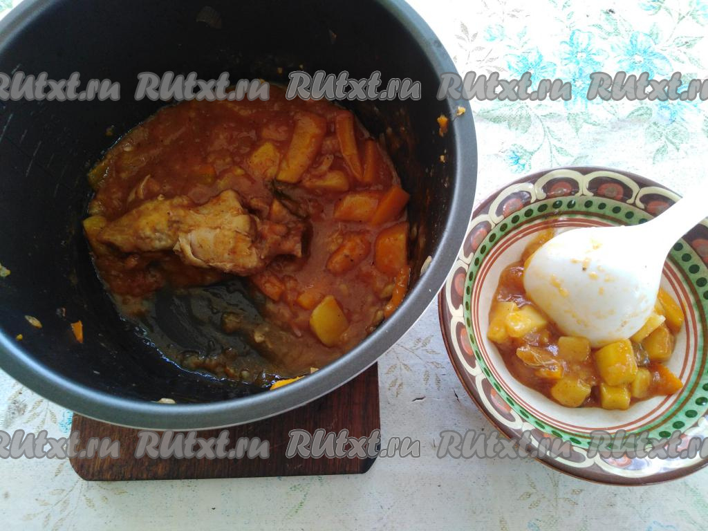 Жаркое из курицы с картошкой подать к столу горячим, дополнив свежими овощами. Благодаря тому, что блюдо готовилось в мультиварке, оно получается необыкновенно вкусным, напоминающим томлёное в печи.