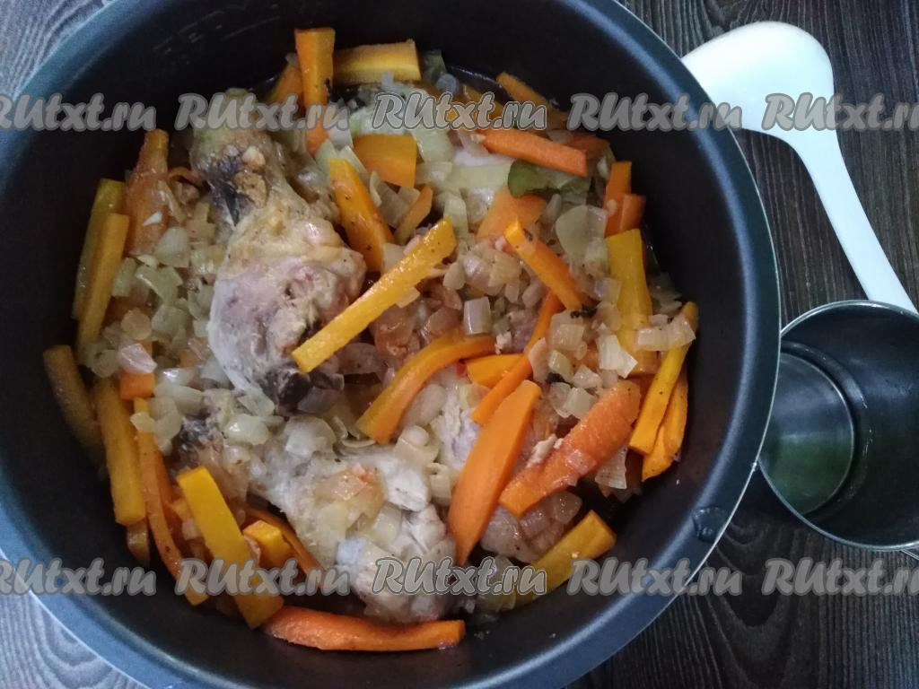 А пока выкладываем в чашу мультиварки нарезанный картофель и обжаренные ножки курицы.