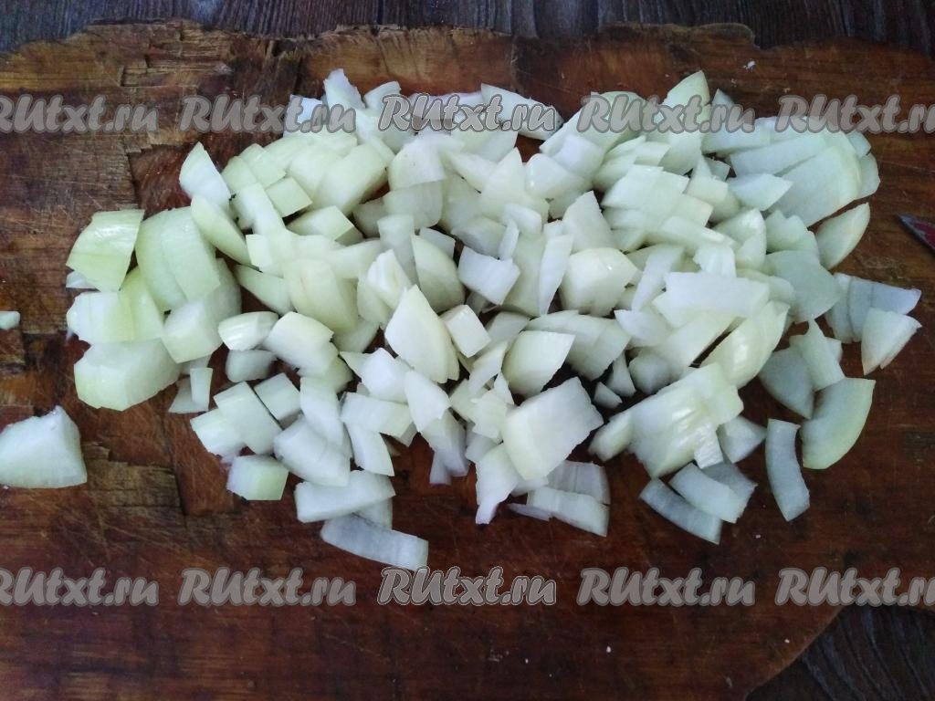 Тем временем займёмся овощами. Очищаем лук от кожуры и нарезаем кубиками среднего размера (не мелко, но и не очень крупно).