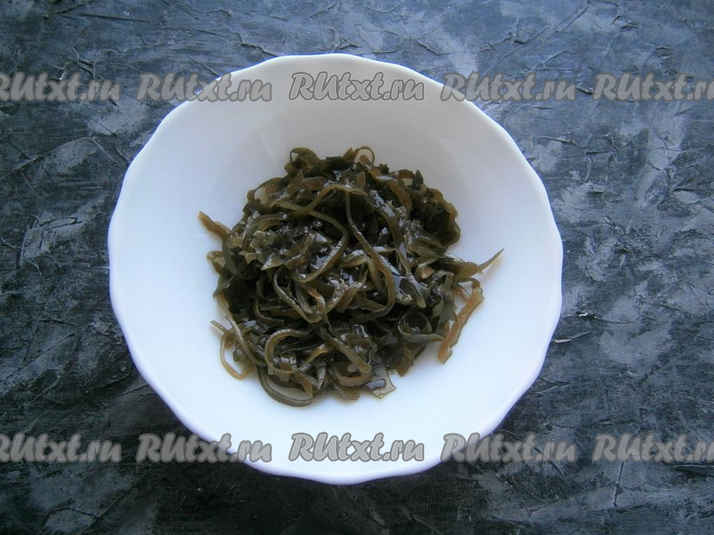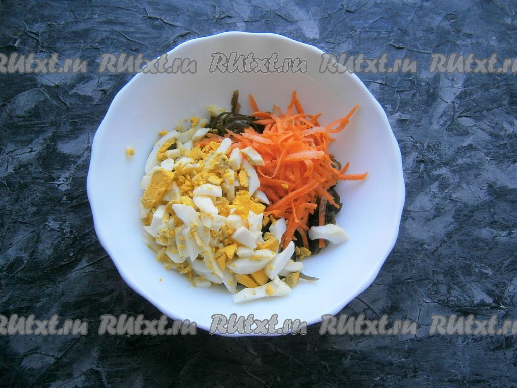 Яйца предварительно отварить вкрутую (на это потребуется 8-10 минут с начала закипания воды), остудить и очистить. Маринованную морскую капусту выложить в миску. Если капуста нарезана очень длинными полосами, их нужно немного измельчить.