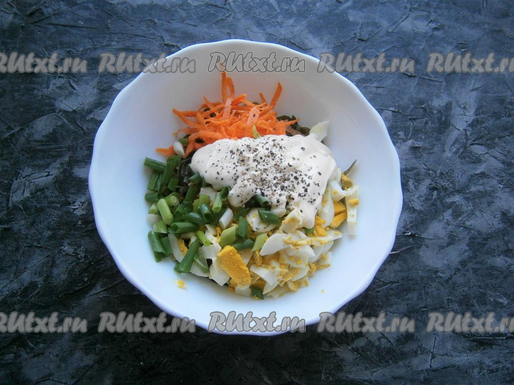 Сырую морковку очистить и натереть на крупной тёрке, яйца нарезать длинными кусочками. Добавить морковку и яйца к морской капусте.