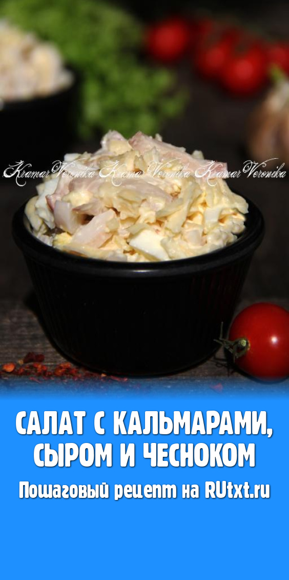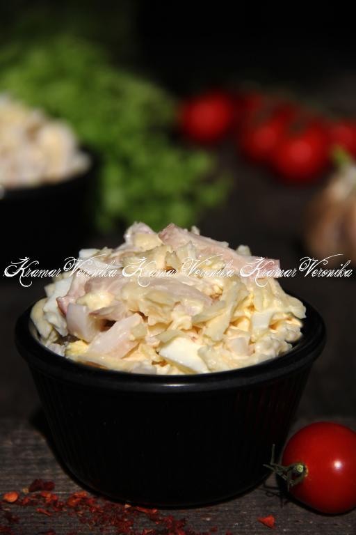 Салат, приготовленный с варёными кальмарами, яйцами, сыром и чесноком, получается нежным, вкусным и сытным, обязательно попробуйте!