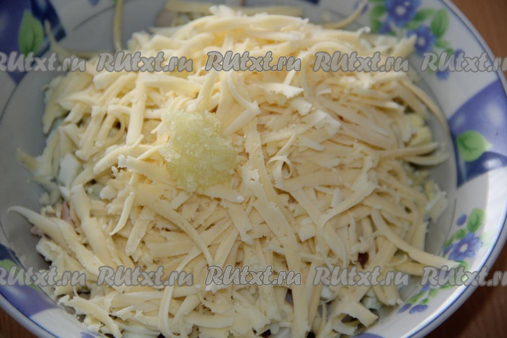 В салат из варёных кальмаров, сыра и яиц добавить пропущенный через пресс зубчик чеснока.