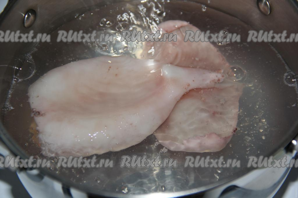 Опустить одну или две тушки кальмара в кипящую воду и с момента закипания воды варить 10 секунд. Затем достать кальмара из воды и остудить. Снова дать воде закипеть, выложить следующую тушку и тоже отварить в течение 10 секунд с момента закипания, достать и остудить.