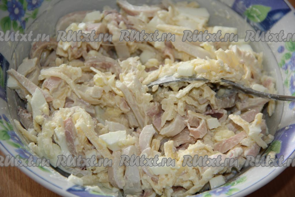 Заправить получившийся салат майонезом, посолить по вкусу, перемешать и можно подавать к столу.