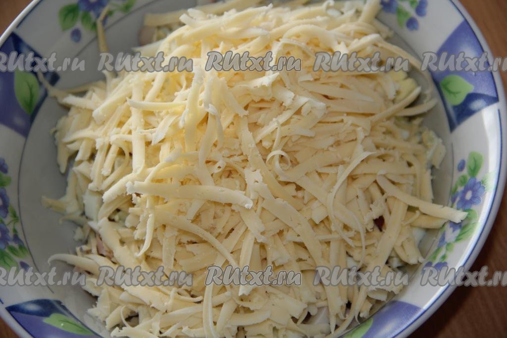 Соединить нарезанных кальмаров и яйца, добавить натёртый сыр.