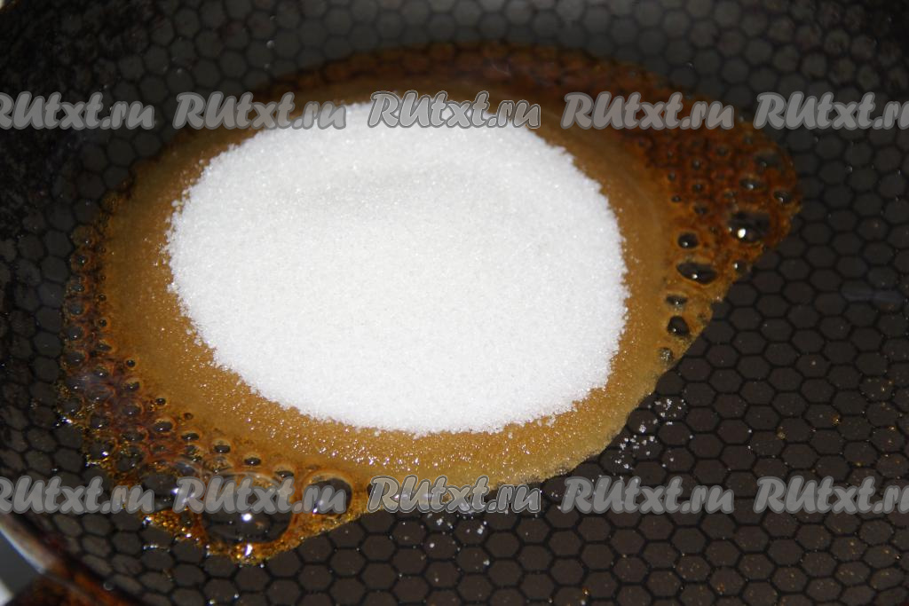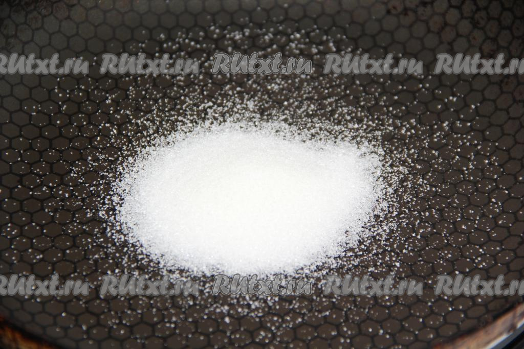 Заранее достать сливочное масло из холодильника, чтобы оно, полежав при комнатной температуре, стало мягким. В сковороду всыпать 1 столовую ложку сахара и, не перемешивая, растопить его на среднем огне.