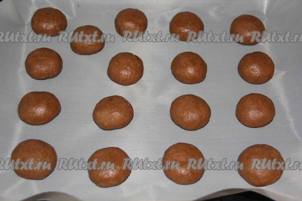 Противень застелить пергаментом. Отщипывать тесто и формировать круглые пряники. У меня пряники по 20 грамм. Выложить пряники на противень на расстоянии друг от друга и поставить в разогретую духовку.