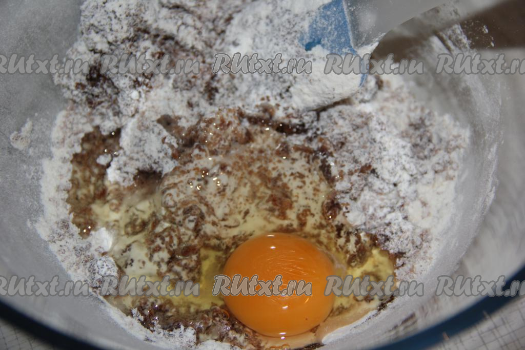 Перемешать массу, тесто заварится в горячей карамели. Когда тесто станет тёплым, добавить яйцо.