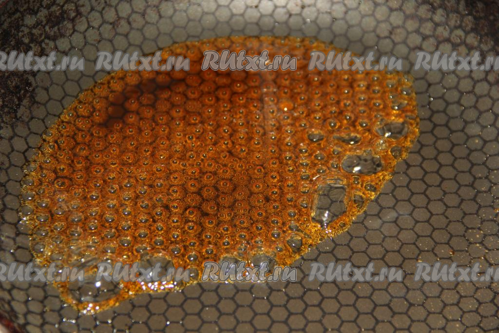 Сахар растворится и приобретёт карамельный оттенок, аккуратно влить в сковороду 50 мл крутого кипятка.