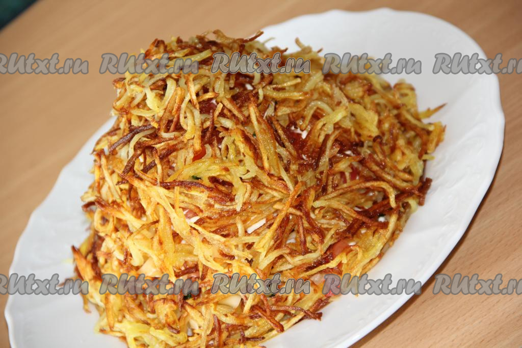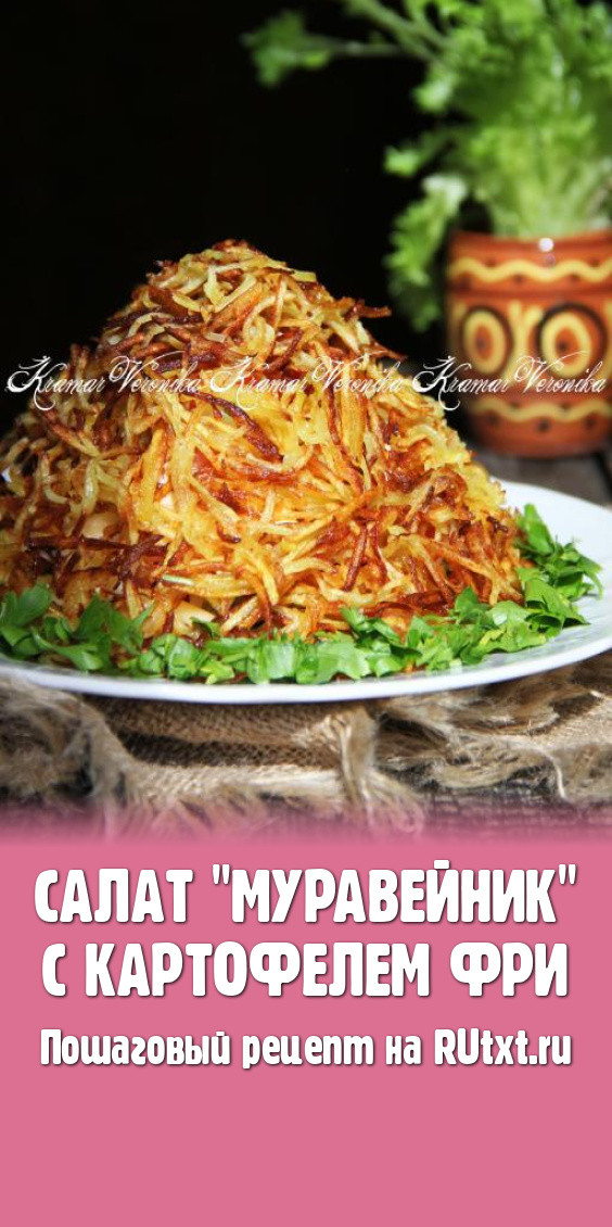 Дать салату настоятся один час (в холодильник лучше не ставить, иначе картофель фри размякнет и перестанет хрустеть) и можно подавать к столу. Вот такой красивый и очень вкусный салат "Муравейник" получился.