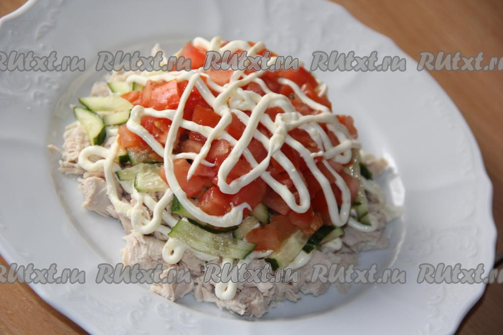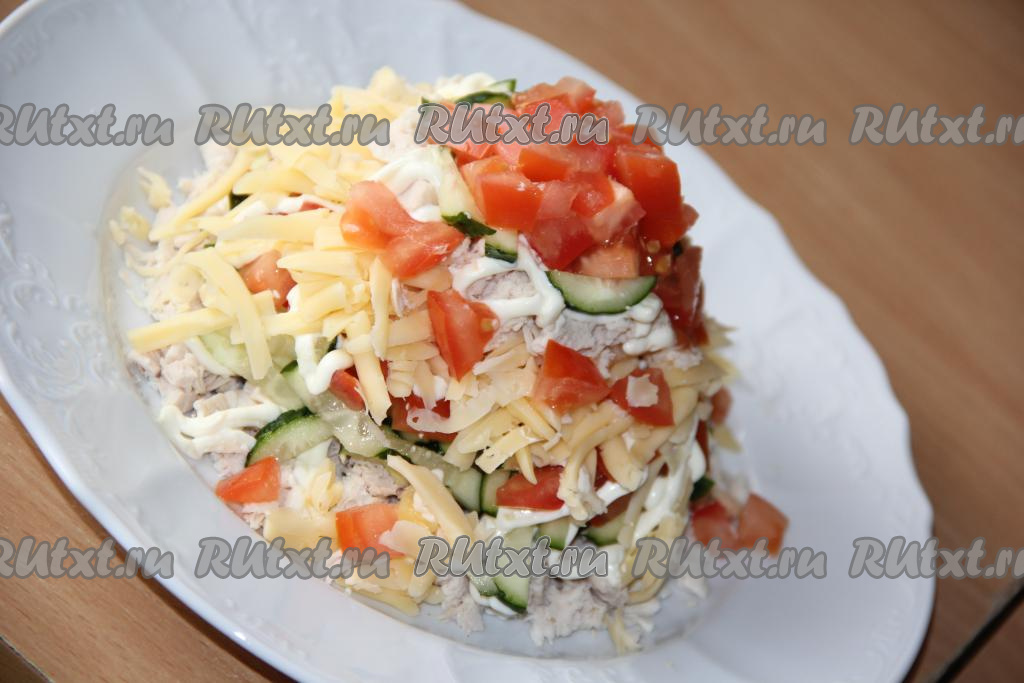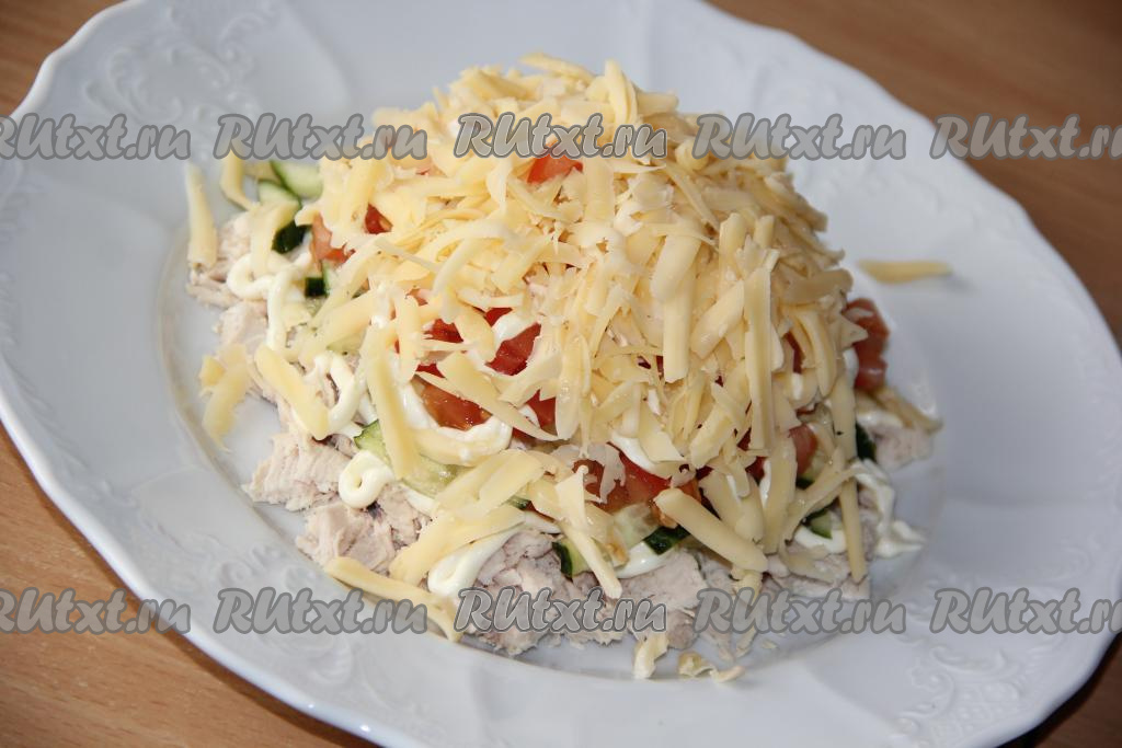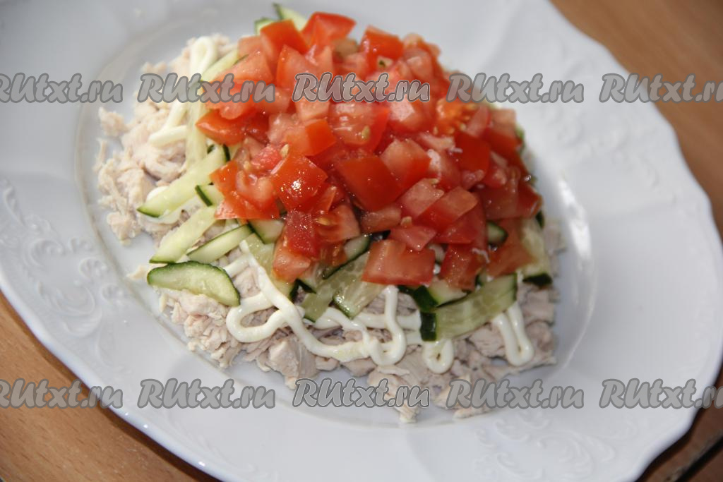 Затем повторить слои, формируя острую верхушку из оставшихся ингредиентов: поверх сыра выложить оставшееся куриное мясо, нанести сеточку из смеси майонеза и чеснока, выложить брусочки свежего огурца и оставшийся помидор.
