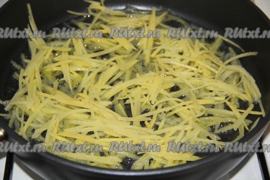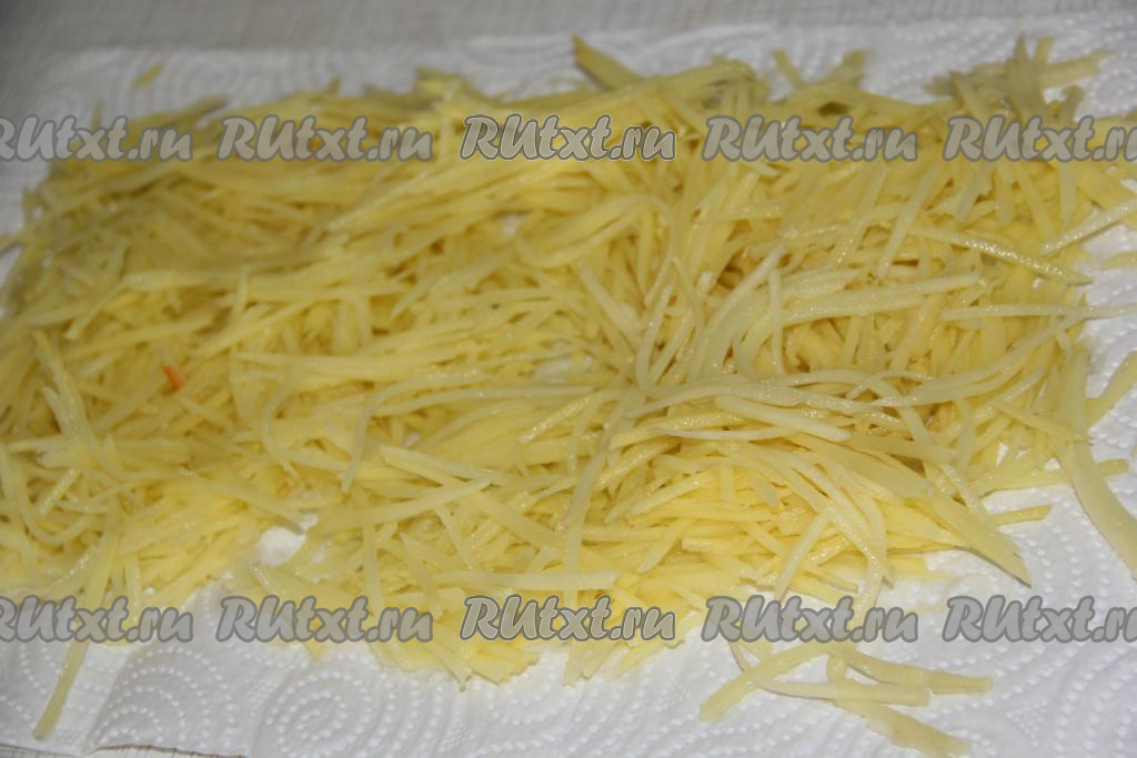 Картофель почистить и натереть на тёрке для моркови по-корейски, промыть водой, выложить в дуршлаг (или сито), чтобы стекла вода, а затем просушить немного на бумажном полотенце.