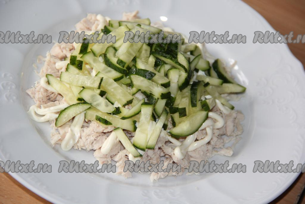 Салат будем выкладывать горкой. Свежий огурчик нарезать на брусочки. Большую часть нарезанного свежего огурца выложить на курицу.