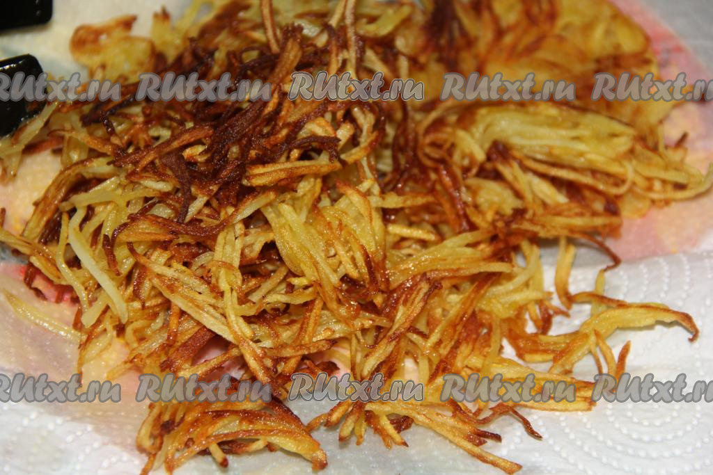 Выложить обжаренный картофель фри на бумажное полотенце, чтобы удалить излишки масла. Таким образом, выкладывая частями картофель на сковороду, обжарить всю картошку до золотистости. Дать картофелю фри остыть на бумажном полотенце.