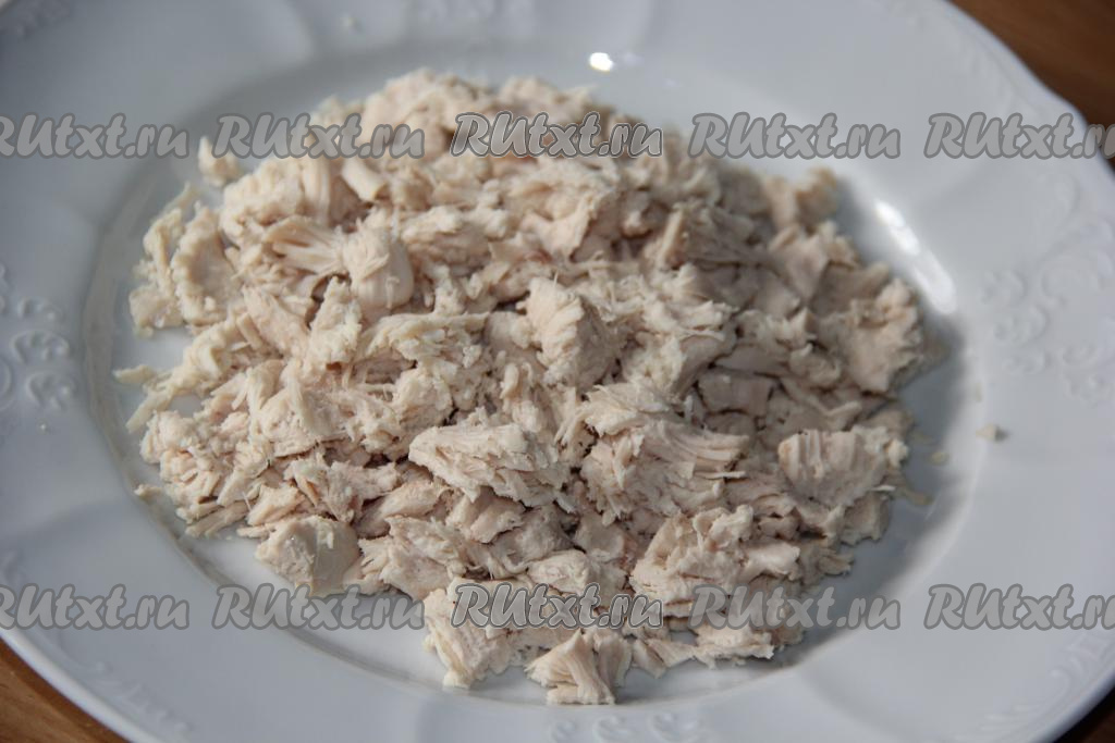 Кусочек курицы (я взяла куриное филе) предварительно отварить до готовности в подсоленной воде (на это потребуется минут 25-30 с начала кипения воды), остудить. 200 грамм отваренного куриного мяса нарезать на небольшие кусочки (или порвать на волокна). 2/3 куриного мяса выложить на тарелку - это будет первый слой салата.