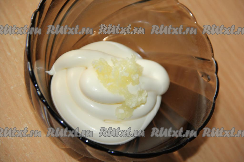 Чеснок почистить и пропустить через пресс. Соединить майонез и чеснок, перемешать.