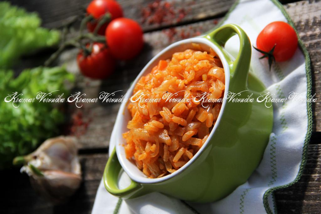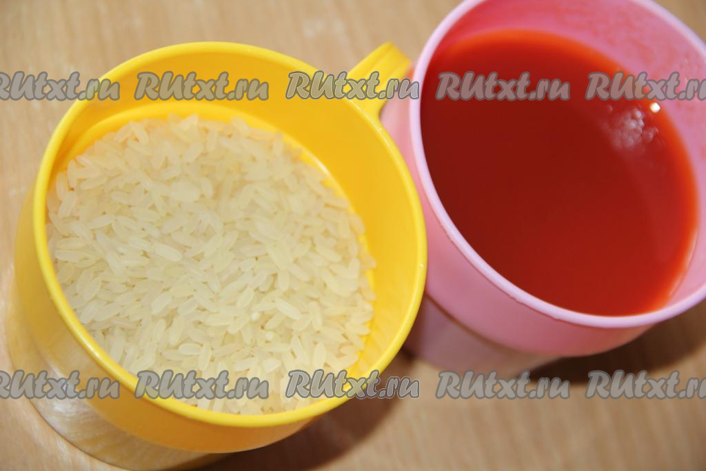 Подготовить рис (я использовала пропаренный рис) и томатный сок. Если нет томатного сока, можно в 170 мл воды развести 30 грамм томатной пасты.