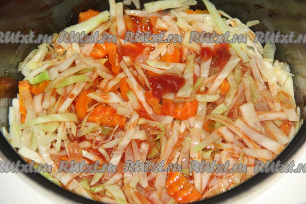 Далее добавить нашинкованную капусту, перемешать овощи и продолжить обжаривать в течение 5 минут, иногда помешивая.