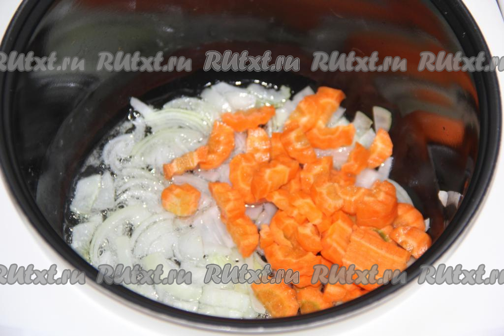 Почистить морковку и лук. В чашу мультиварки влить масло, выложить мелко нарезанный лук и морковку, нарезанную на кубики, обжарить их в течение 10 минут на режиме "Жарка", постоянно помешивая.