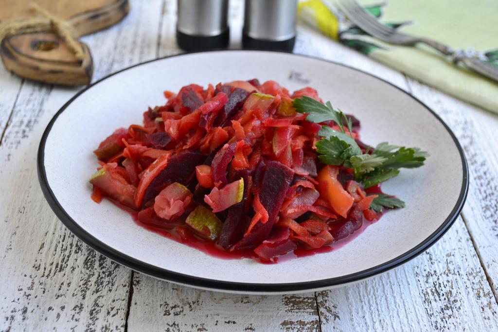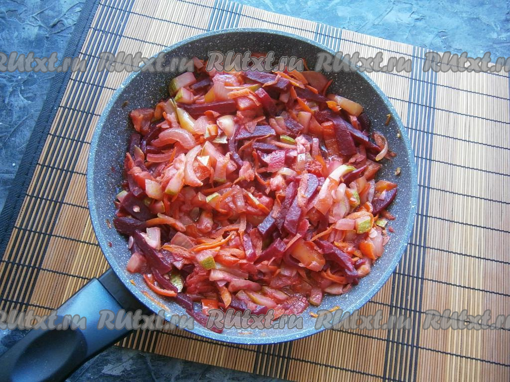 Обжарить кабачок на среднем огне, помешивая, 3-4 минуты. Почистить лук, морковь и отваренную (или запечённую) свеклу, из болгарского перца удалить семенную коробку и плодоножку. К обжаренному кабачку добавить натёртую морковь, нарезанные кусочками репчатый лук и сладкий болгарский перец.