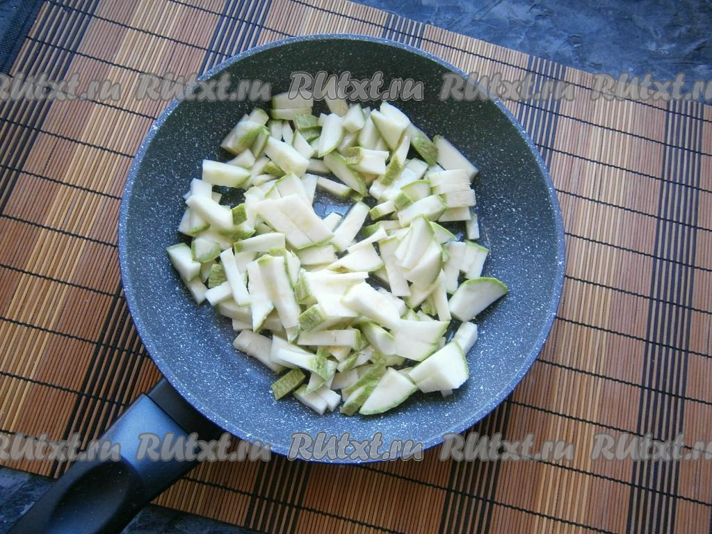Кабачок для приготовления рагу лучше брать с тонкой кожицей и мелкими семенами (если же кожица у кабачка жестковата, тогда её лучше срезать, крупные семечки тоже желательно удалить). Кабачок нарезать небольшими кусочками и поместить его в сковороду, влить растительное масло.