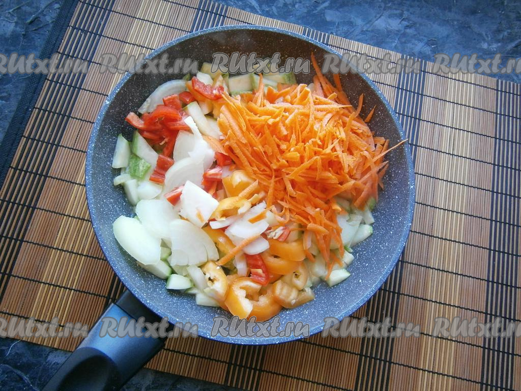 Перемешать и обжарить на среднем огне, иногда помешивая, до мягкости овощей (3-5 минут). Когда овощи станут мягкими, добавить к ним нарезанные небольшими кусочками свежие помидоры, соль, приправу и паприку.