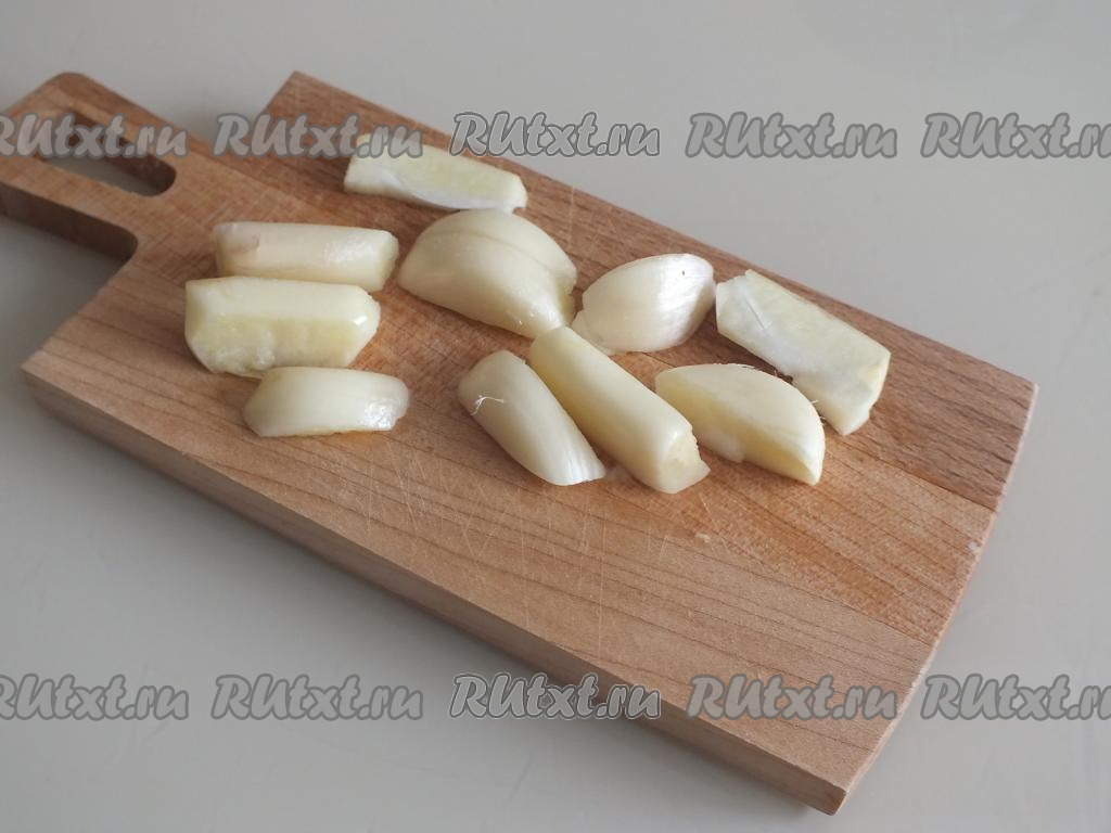 Зубчики чеснока очистите и разрежьте на части, из расчёта 1-2 кусочка на каждый помидор.