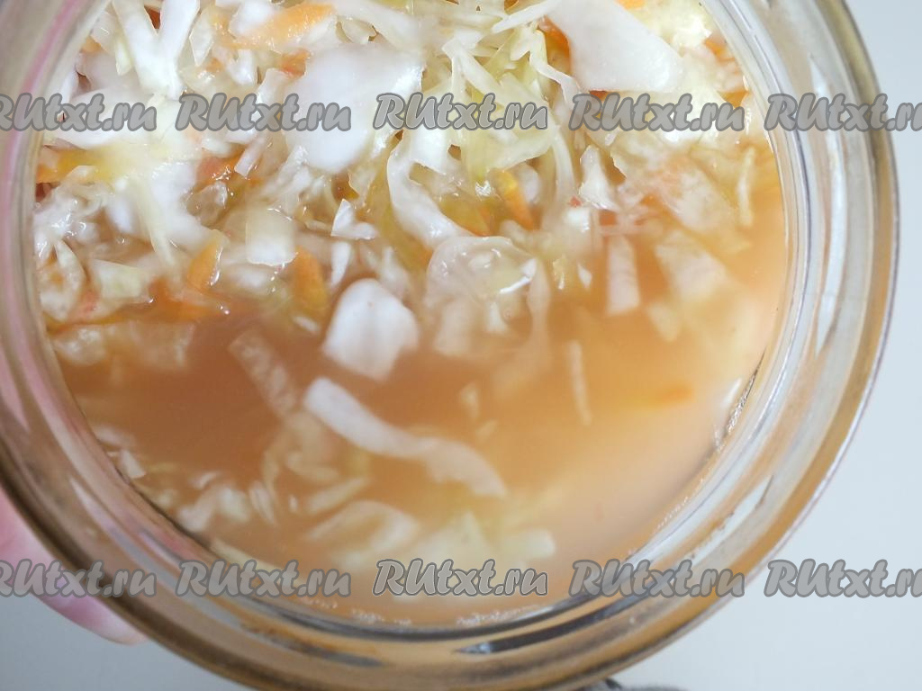 Залейте содержимое банки охлаждённым рассолом. Он должен покрыть полностью капусту и даже может слегка выступать над ней.