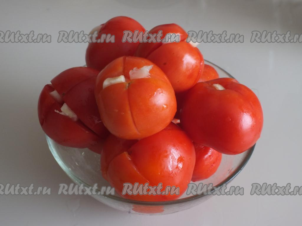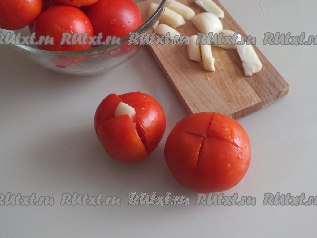 Помидоры вымойте. Сделайте крестообразный разрез в верхней части каждого плода, не дорезая до конца. В отверстие вложите по 1-2 кусочка чеснока.