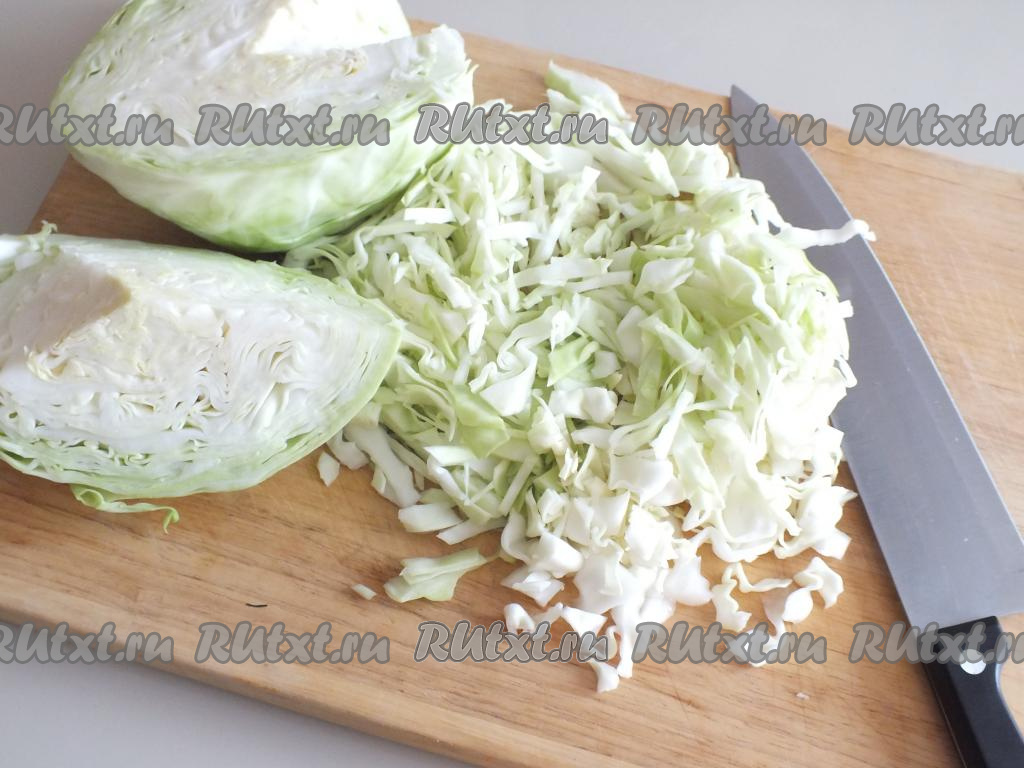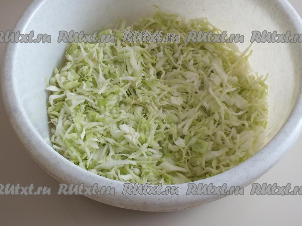 Возьмите объёмную миску, переложите в неё капусту, чередуя с морковью. Добавьте 0,25 столовой ложки соли и перемешайте (сильно перетирать и жать не нужно). Отставьте капусту в сторону.