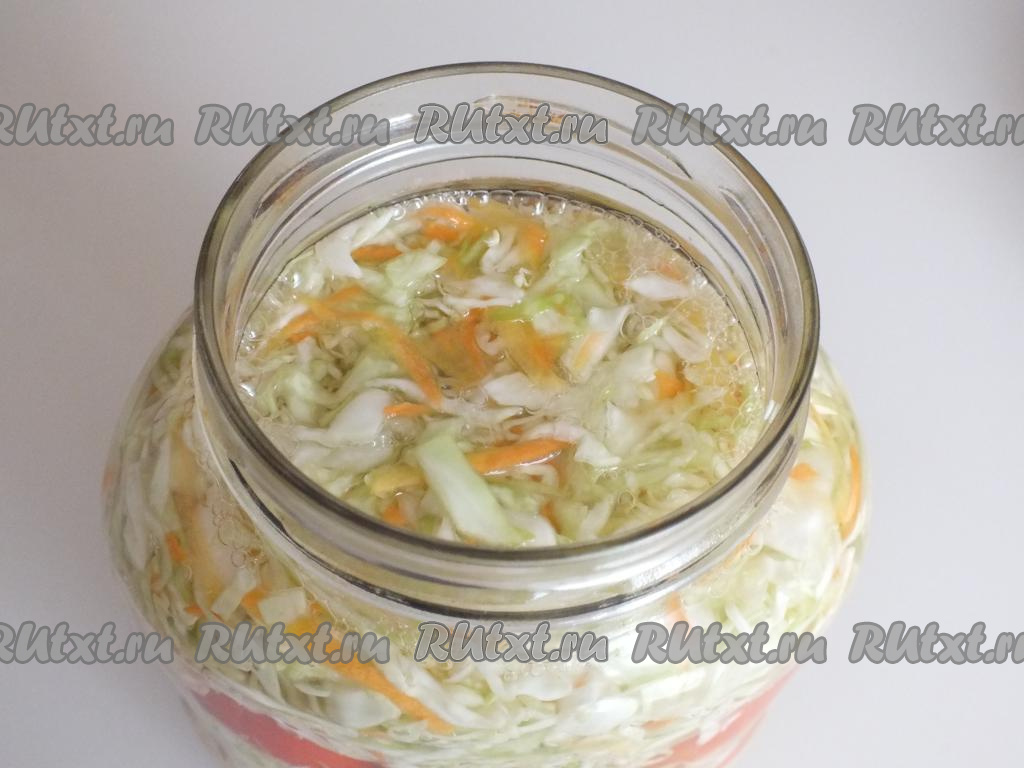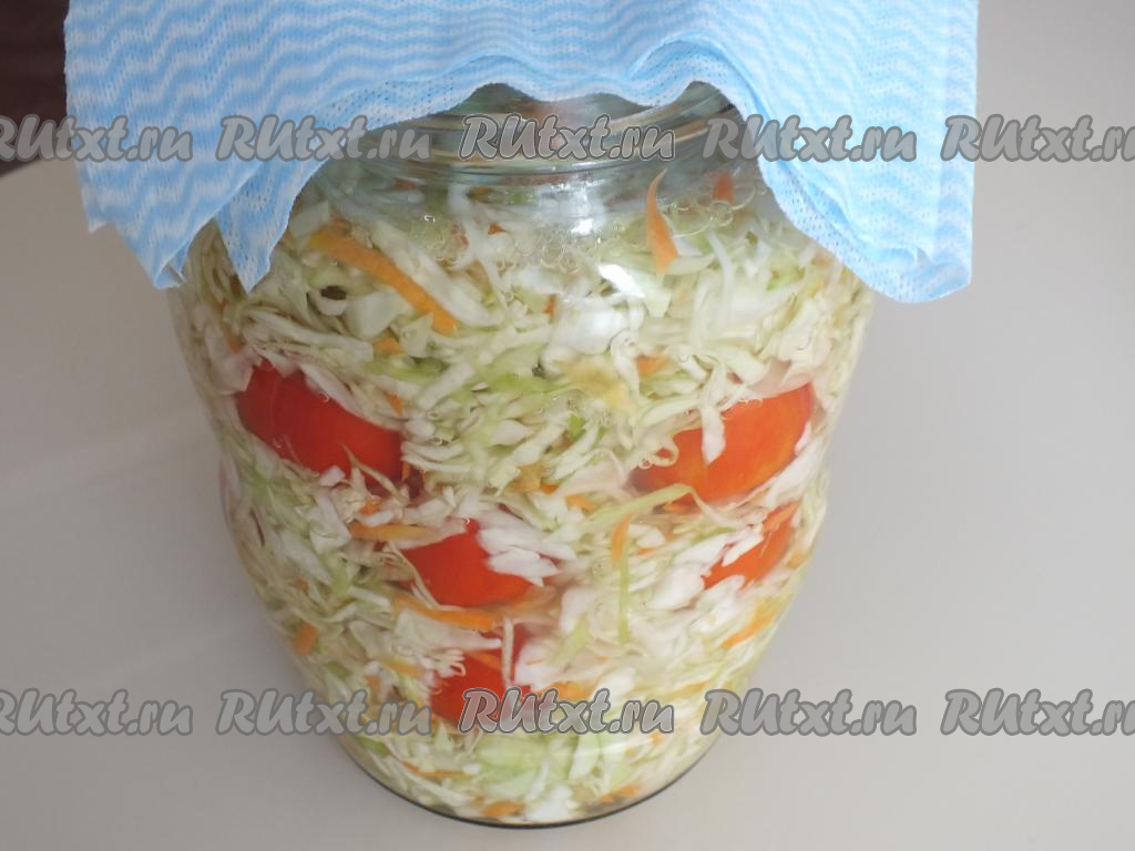 Подобным образом заполните банку до верха, чередуя слои капусты с помидорами. Важно, чтобы верхний слой был капустный!