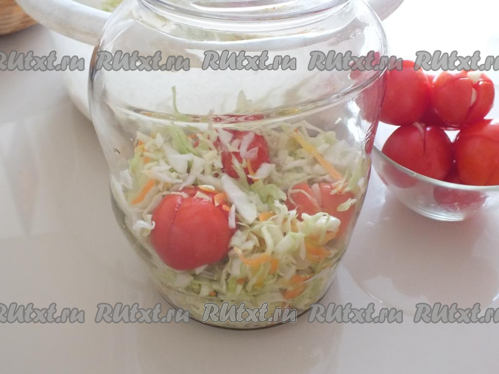 Возьмите банку объёмом 1,8 или 2 литра, вымойте. Стерилизовать не нужно. На дно бросьте 2 крупные горсти капусты с морковью. На капусту на расстоянии друг от друга выложите 3-4 помидора.
