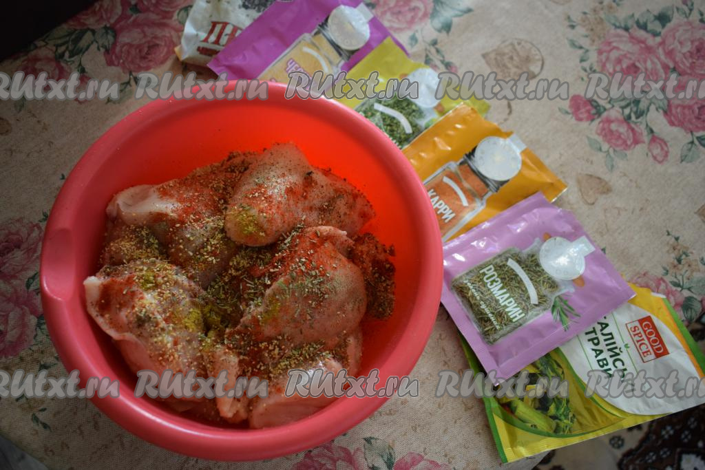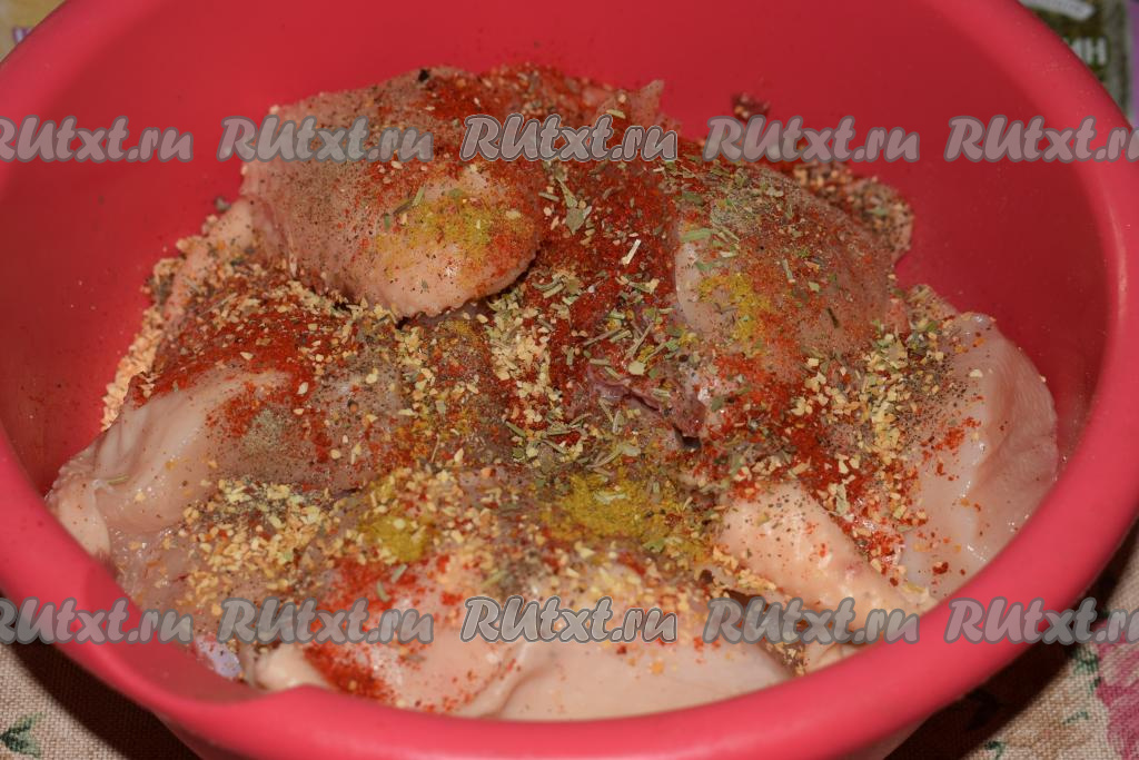 Складываем кусочки курицы в миску и добавляем соль, перец, сушёный чеснок и различные любимые вами специи (у меня паприка, базилик, кари, итальянские травы и розмарин).