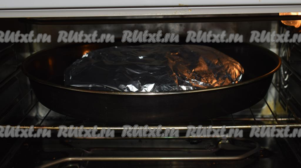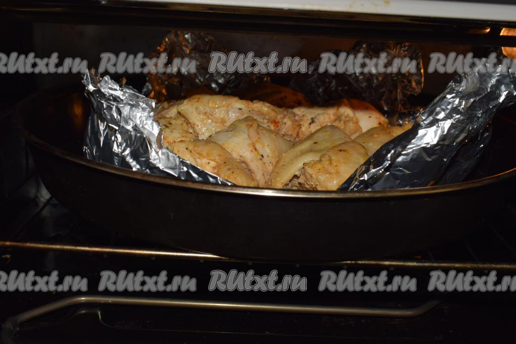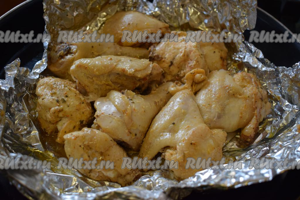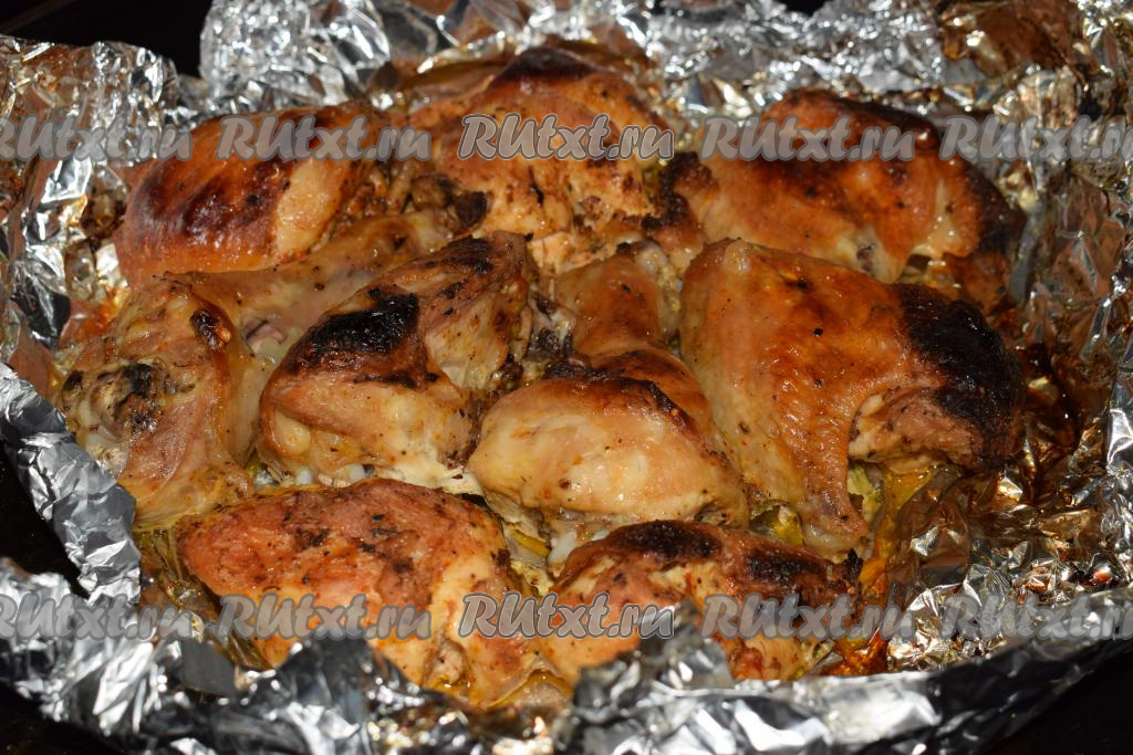 Отправляем кусочки курицы в фольге в разогретую духовку и запекаем при температуре 200-210 градусов, примерно, 1 час.