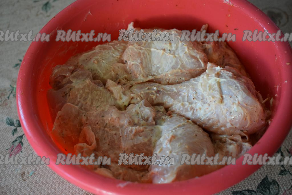Добавляем майонез и ещё раз перемешиваем. Оставляем курицу для маринования на 1 час.