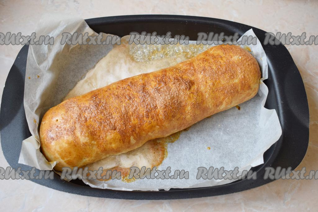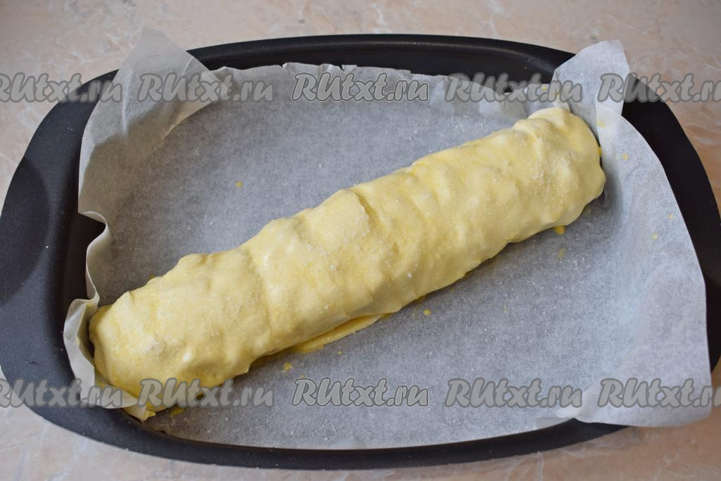 Начиная с широкой стороны, скрутите слоёное тесто с яблоками в рулет. Края с двух сторон подверните под низ рулета, чтобы начинка не вываливалась. Переложите рулет в форму для выпечки, застеленную пекарской бумагой. Верх рулета смажьте яичным желтком по всей поверхности. Это необходимо для того, чтобы рулет стал аппетитного золотистого цвета. Сверху можно посыпать немного сахаром. Поставьте рулет в духовку, разогретую до 180 градусов, на 35-45 минут (верх рулета должен стать золотистым). Ориентируйтесь по своей духовке, регулируя продолжительность выпечки.