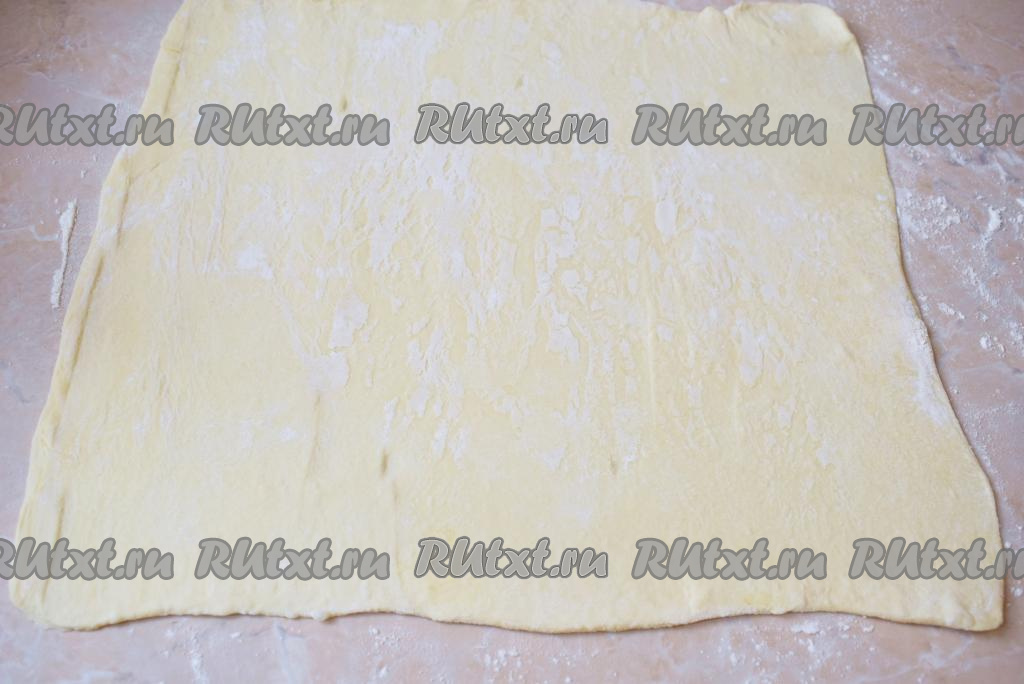 Для приготовления рулета можно использовать любое слоёное тесто - дрожжевое или бездрожжевое. Слоёное тесто обычно продаётся в замороженном виде, поэтому ему необходимо предварительно дать оттаять. Заранее достаньте его из морозильной камеры и дайте полежать при комнатной температуре. Стол присыпьте мукой. Мягкое тесто с помощью скалки, присыпанной мукой, немного раскатайте в прямоугольник.