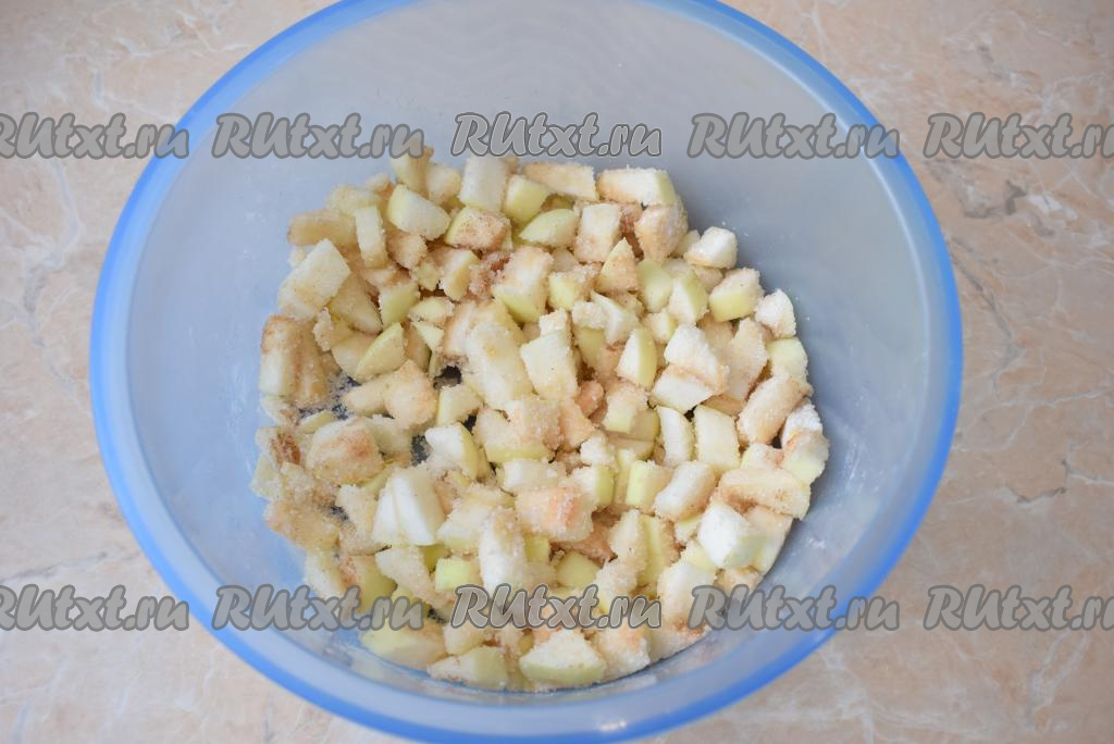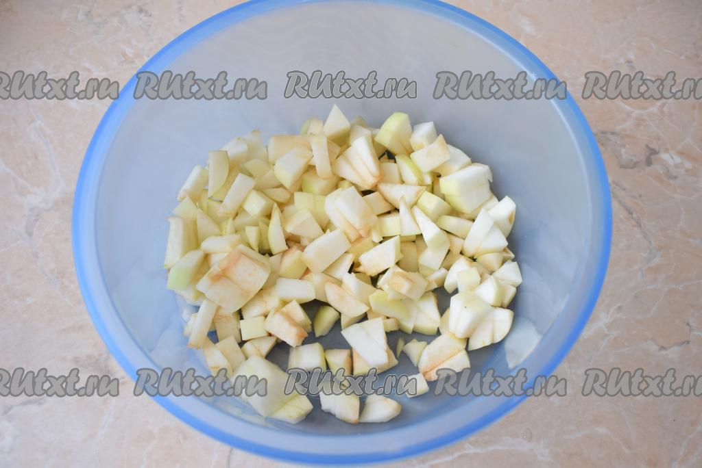 Для приготовления начинки яблоки хорошо промойте в проточной воде и обсушите. Затем разрежьте каждое яблоко на 4 части и удалите сердцевину. Нарежьте яблоки на мелкие кусочки. Для начинки лучше всего использовать кисло-сладкие яблоки.